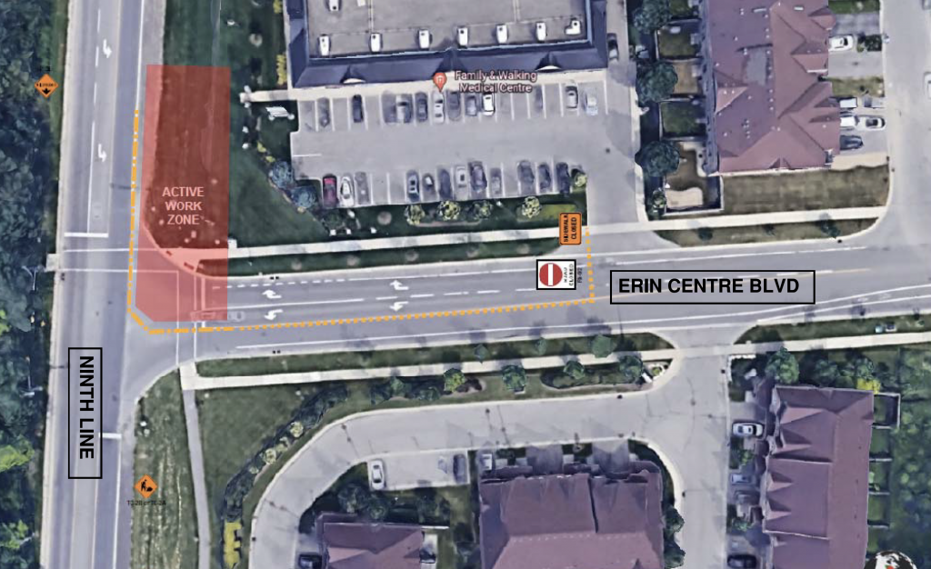 Please be advised a Sanitary sewer installation will occur along the east side of Ninth Line, south of Erin Centre Blvd. To facilitate a sewer connection at Erin Centre Blvd, a partial road closure is required. The closure will take place from July 4th to September 2nd, 2022. The partial closure will allow for traffic to travel east bound along Erin Centre Blvd, but the westbound lanes will be closed.