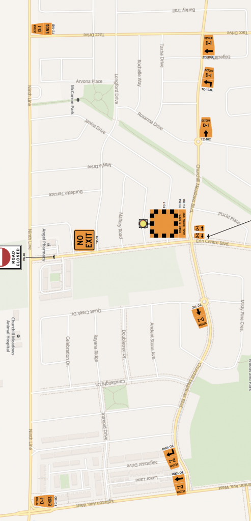 Please refer to the drawings below outlining the location and closure on Erin Centre Blvd. Churchill Meadows Blvd to TACC Drive will be used as an alternative route (D–1) to gain access to Ninth Line. In addition, Churchill Meadows Blvd to Eglinton Ave West can also be used as an alternative route (D–2) to gain access to Ninth Line. Please refer to the alternative travel route plan below. MiWay bus routes are also on Detour as outlined in this document. Should you have any question, please do not hesitate to contact the project consultant – information below. Thank you in advance for your co–operation and we apologize for any inconvenience.